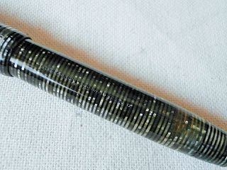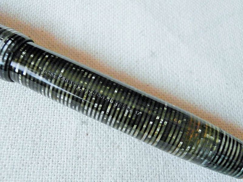 Foto di una penna Parker. Modello: Vacumatic. Caricamento vacumatic. Realizzazione in celluloide anellata grigia. Dettaglio della stampigliatura. Misura massima (oversize). Contributo di Fabrizio Falchi, (utente forum fountainpen.it fab66).