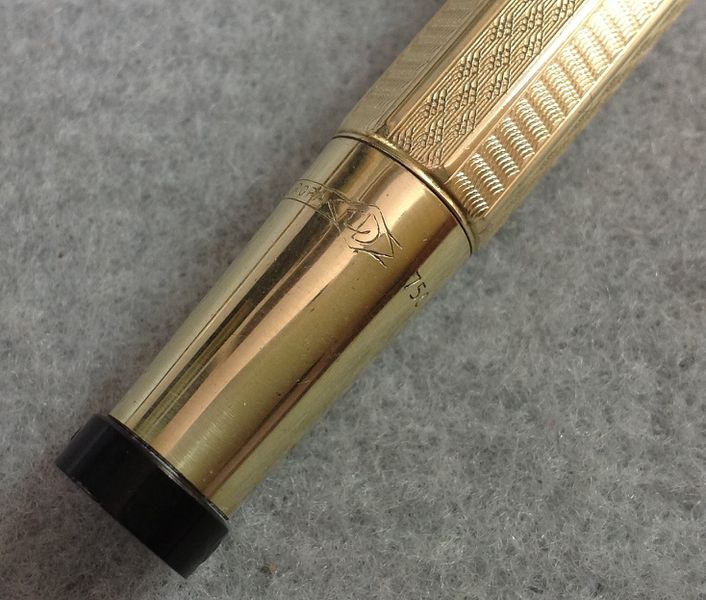 Photo of a pen produced by Europa. Filling system: safety. With geometric patter gold rolled overlay. Model by Fratelli Cavaliere, with a Linda Darnes punch.