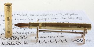 Photo of a pen produced by Eversharp. Model: Wahl Metal Pen. Filling system: lever filler. In engine turned gold filled metal. Big size, n. 5 nib, in the Grecian Border pattern.