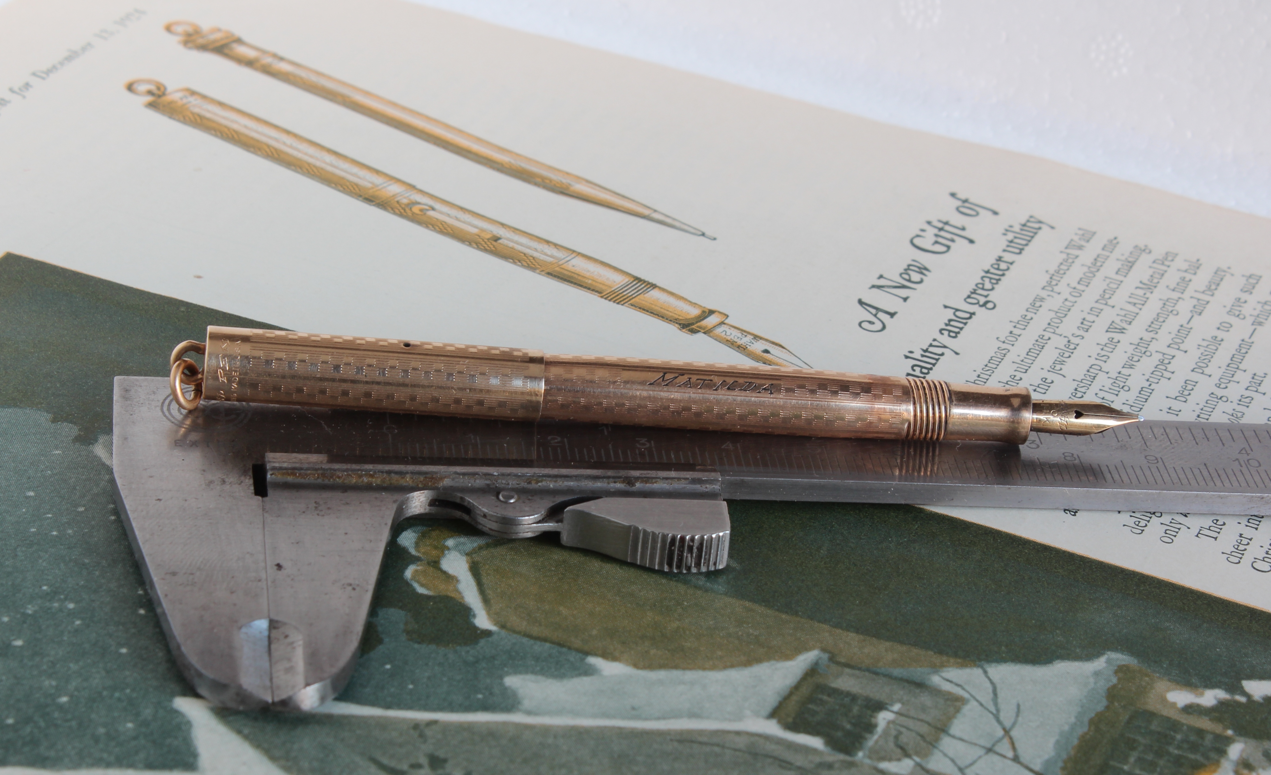 Foto di una penna Eversharp. Modello: Wahl Metal Pen. Caricamento a levetta. Realizzazione in metallo laminato oro con lavorazione guilloché. Misura mignon da signora, pennino n. 0, nella lavorazione Checkerboard.