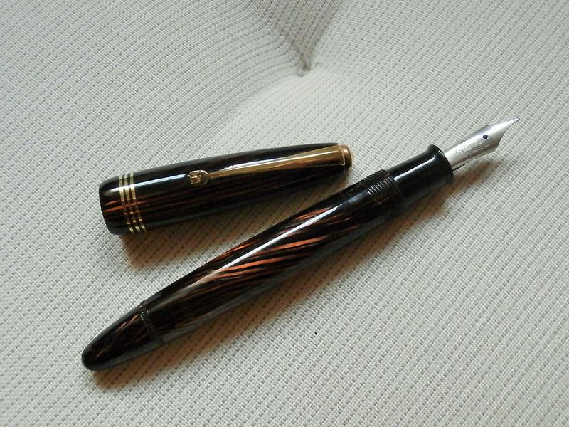 Foto di una penna Liset. Caricamento a pulsante di fondo. Realizzazione in celluloide striata marrone. Modello ignoto, con fermaglio a rotellina. Contributo di Fabrizio Falchi, (utente forum fountainpen.it fab66).