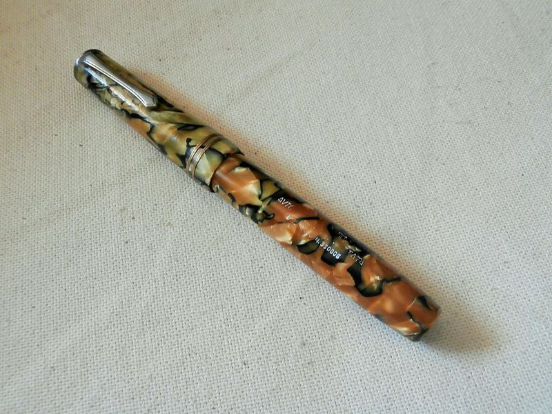 Photo of a pen produced by F.E.R.T. (a Pagliero trademark) marked "Automatica Brevettata". Filling system: pincer filler. In pearl and black celluloid. Detail of nib. Unknown model. Patent number (nº IT-330806) imprinted.