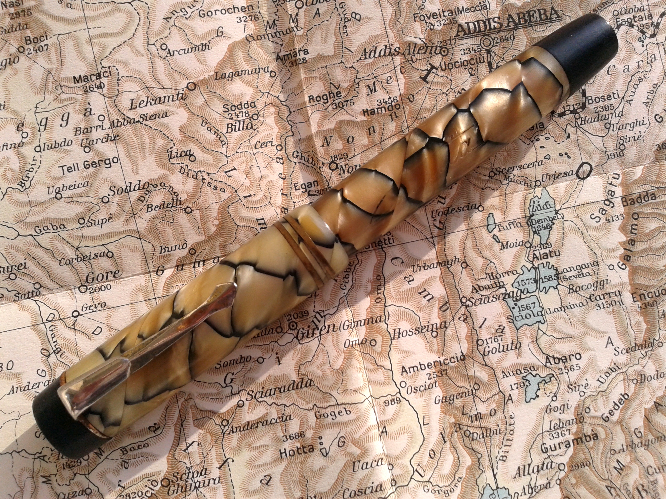 Foto di una penna Ardita (un marchio della Omega A.V.M.). Caricamento a pulsante di fondo. Realizzazione in celluloide wild perla e nero. Modello ignoto. Contributo di Giorgio (utente forum Musicus).