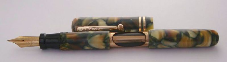 Photo of a pen produced by LeBoeuf. Filling system: sleeve filler. In black and pearl celluloid. Nib #8.