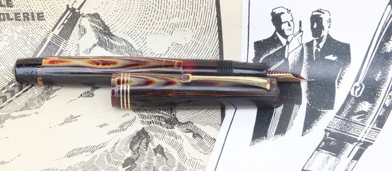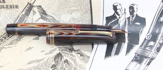 Foto di una penna Minerva (sottomarca Officine Meccaniche Armando Simoni). Caricamento a stantuffo. Realizzazione in celluloide "arco" marrone. Fotografata all'incontro Penneggiando in Maremma.