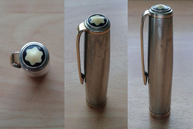 Foto di una penna Montblanc. Modello: Montblanc 644. Caricamento a stantuffo. Realizzazione in celluloide nera. Dettaglio del cappuccio. Versione per il mercato inglese marcata "Masterpiece". Contributo di Giorgio (utente forum Musicus).