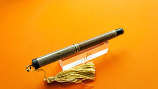 Photo of a pen produced by Parker. Model: Ivorine. Filling system: button filler. In moire green celluloid. Detail of filling system. Lady version with cap ring and band in black with external gold rings.