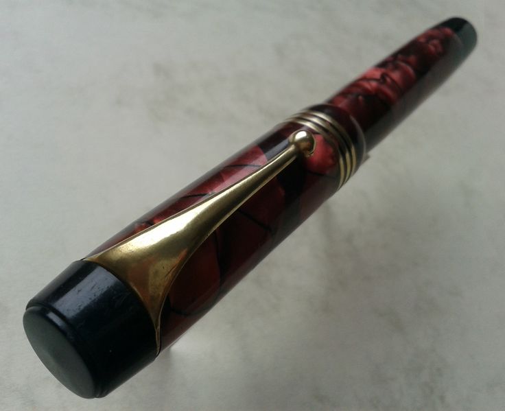Foto di una penna Helios. Caricamento a pulsante di fondo. Realizzazione in celluloide marmorizzata rossa. Modello non identificato, imitazione di una Duofold streamlined. Contributo di Giorgio (utente forum Musicus).