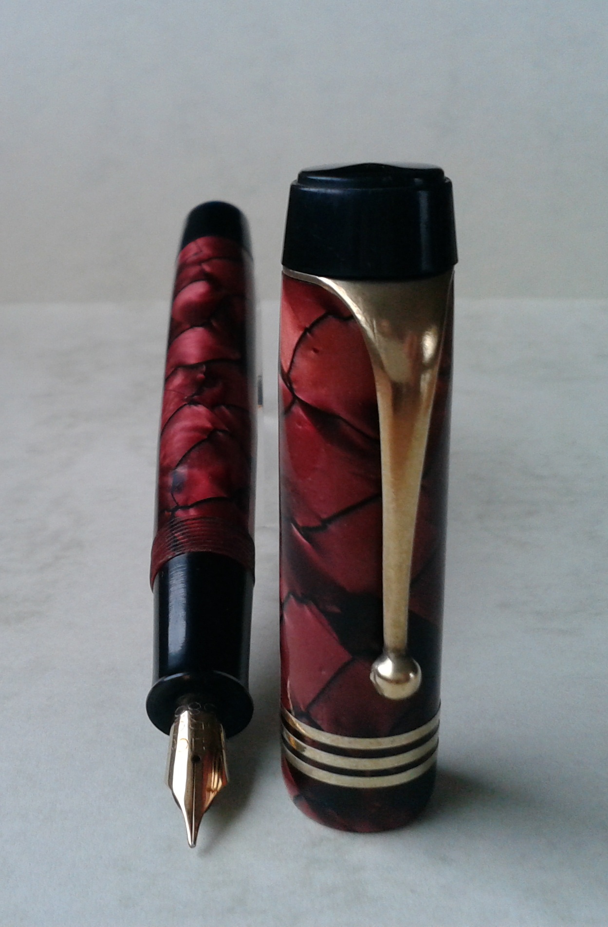 Foto di una penna Helios. Caricamento a pulsante di fondo. Realizzazione in celluloide marmorizzata rossa. Modello non identificato, imitazione di una Duofold streamlined. Contributo di Giorgio (utente forum Musicus).