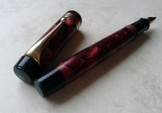 Foto di una penna Helios. Caricamento a pulsante di fondo. Realizzazione in celluloide marmorizzata rossa. Modello non identificato, imitazione di una Duofold streamlined. Contributo di Giorgio (utente forum Musicus).