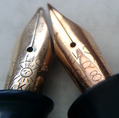 Photo of a pair of pens produced by Helios. Detail of nib. Comparaison between two nib version; an older on with "KAR" german imprint and a sun logo, and a newer one with the italian "Helios Oro" imprint.