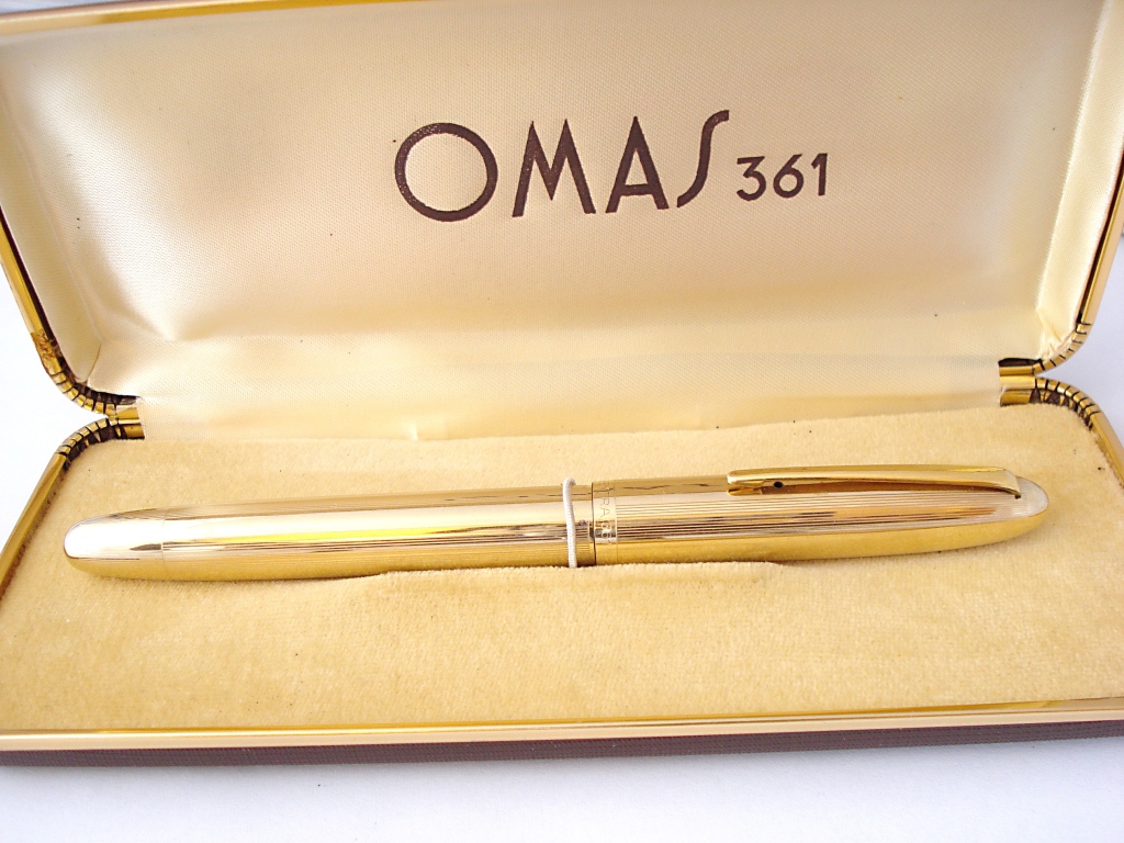Photo of a pen produced by Omas. Model: Omas 361/R. Filling system: piston filler. With lined gold rolled overlay. Fully covered version, standard size.
