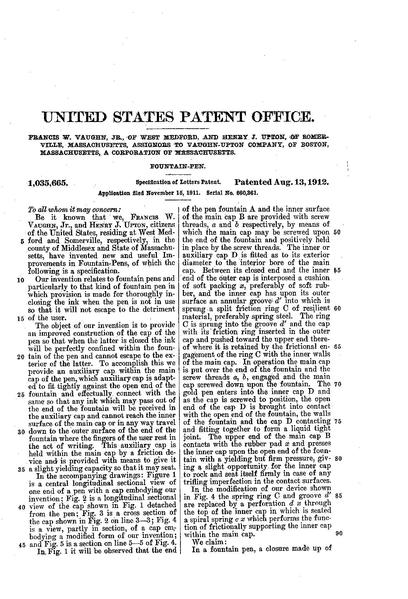 attuale16:38, 19 ago 2012Miniatura della versione delle 16:38, 19 ago 20121 159 × 1 704, 3 pagine (94 KB)Piccardi (discussione | contributi){{PatentInfo |Inventor=Francis W. Vaughn, Henry J. Upton |Assignee=Vaughn-Upton Company |Country=US |ApplicationNum=660361 |ApplicationDate=1911-11-15 |PatentNum=1035665 |PatentDate=1912-08-13 |PriorityDate=1911-11-15 |Titolo=Fountain-pen |Marca=Unbran...