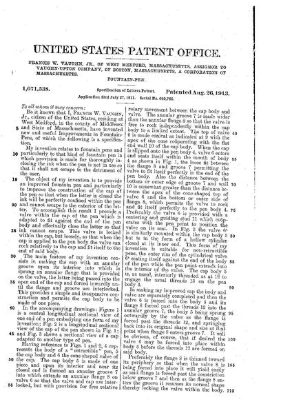 | attuale | 16:54, 19 ago 2012 | 1 159 × 1 704, 3 pagine (105 KB) | Piccardi (discussione | contributi) | {{PatentInfo |Inventor=Francis W. Vaughn Jr. |Assignee=Vaughn-Upton Company |Country=US |ApplicationNum=640766 |ApplicationDate=1911-07-27 |PatentNum=1071538 |PatentDate=1913-08-26 |PriorityDate=1911-07-27 |Titolo=Fountain-pen |Marca=Unbranded |Descriz... |