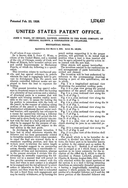 Brevetto per una matita meccanica. Riferimenti a nº US-1151016 e nº US-1279186.
