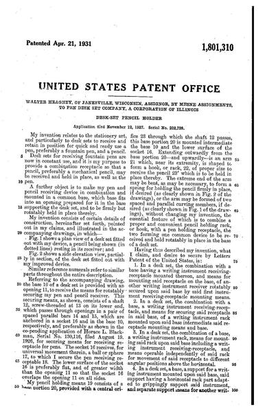Brevetto per la base di uno stiloforo. Usato della Parker e dalla Eversharp, appare sul foglietto sottostante di stilofori di queste aziende.