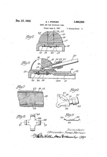 Brevetto per la base di uno stiloforo. Usato della Parker e dalla Eversharp, appare sul foglietto sottostante di stilofori di queste aziende.