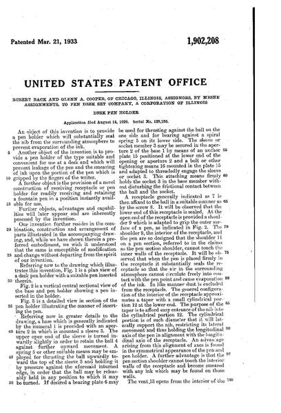 Brevetto per la base di uno stiloforo. Usato della Parker e dalla Eversharp, appare sul foglietto sottostante di stilofori di queste aziende.