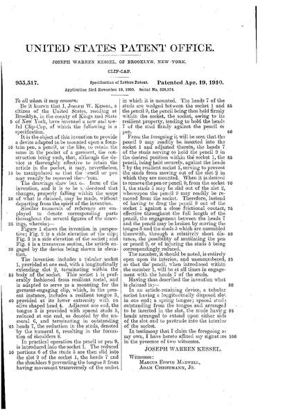 Brevetto per un fermaglio con montaggio a rivetti, simile, anche nel nome, alla Clip-Cap della Waterman. Il brevetto venne acquisito (vedi [1]) da quest'ultima. Stampigliato sul fermaglio delle Waterman 12PSF e delle Waterman 12S.
