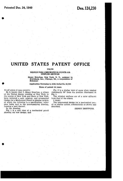 | attuale | 20:33, 7 ott 2012 | 1 159 × 1 704, 2 pagine (39 KB) | Piccardi (discussione | contributi) | {{PatentInfo |Inventor=Henry Dreyfuss |Assignee=The Wahl Company |Country=US |ApplicationNum=96361 |ApplicationDate=1940-11-06 |PatentNum=D124230 |PatentDate=1940-12-24 |PriorityDate=1940-11-06 |Titolo=Design for a pencil or similar article |Marca=Ever... |