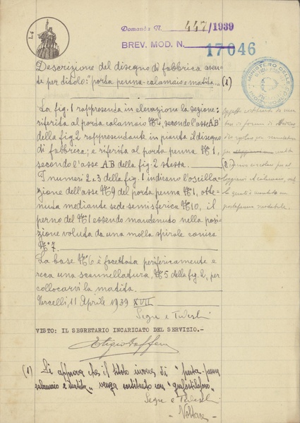 Privativa industriale per un modello ornamentale. Testo descrittivo della registrazione: "Oggetto costituito da una base di forma di ottaedro regolare con scanalatura per matita e incavo circolare per alloggiarvi il calamaio, sulla quale è montato un porta penna snodabile".