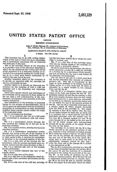 Brevetto per una penna a sfera. Riferimenti a nº US-1205004, nº US-1461823, nº US-1671125, nº US-1701263, nº US-1811763, nº US-1839160, nº US-1922831, nº US-2107424, nº US-2398548 e nº US-2428960.