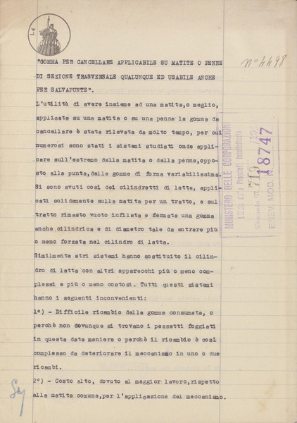 Privativa industriale per un modello di fabbrica. Testo descrittivo della registrazione: "Gomma per cancellare applicabile su matite o penne di sezione trasversale qyalunque e usabile anche per salvapunte".
