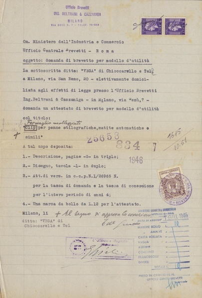 Privativa industriale per un modello di utilità della VEGA. Testo descrittivo della registrazione: "Fermaglio molleggiato per penne stilografiche, matite automatiche e simili".
