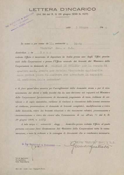 Privativa industriale per un modello di utilità. Testo descrittivo della registrazione: "Serbatoio applicabile alle comuni penne da scrivere per aumentare la capacità di scrittura delle medesime".