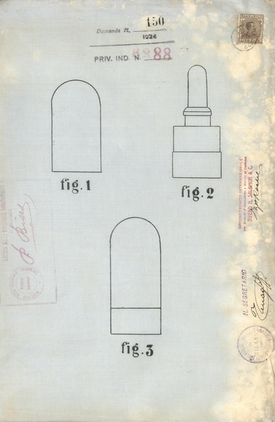 Privativa industriale per un modello di fabbrica. Testo descrittivo della registrazione: "Flacone e porta flacone di sicurezza in un sol pezzo per inchiostro da penne stilografiche".