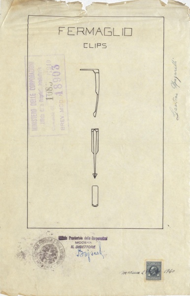 Privativa industriale per un modello di fabbrica. Testo descrittivo della registrazione: "Fermaglio (clips) per penne stilografiche e matite automatiche, da costruirsi in materiali e dimensioni varie".
