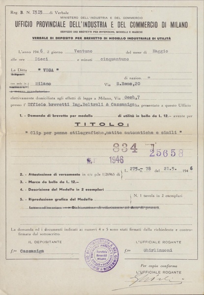 Privativa industriale per un modello di utilità della VEGA. Testo descrittivo della registrazione: "Fermaglio molleggiato per penne stilografiche, matite automatiche e simili".