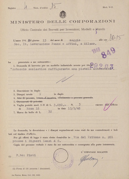Privativa industriale per un modello di fabbrica della Silpa. Testo descrittivo della registrazione: "Astuccio scolastico raffigurante una pistola automatica".