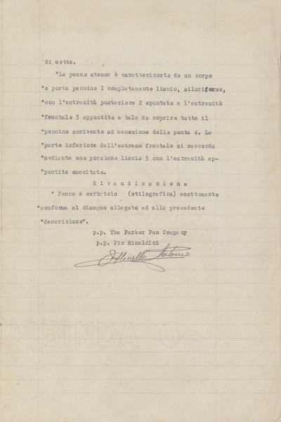 Privativa industriale per un modello di fabbrica della Parker per il modello Parker 51. Testo descrittivo della registrazione: "Penna a serbatoio siluriforme con estremità posteriore spuntata ed estremità anteriore appuntita, ricoprente quasi completamente il pennino".
