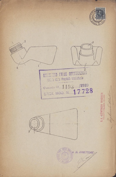 Privativa industriale per un modello di utilità della Pelikan. Testo descrittivo della registrazione: "Boccetta per inchiostro, sviluppata orizzontalmente con strozzatura formante un pozzetto anteriore, inclinato dove si intinge la penna".