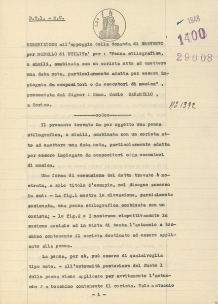 Privativa industriale per un modello di utilità della CISEA. Testo descrittivo della registrazione: "Penna stilografica, o simili, combinata con un corista atto ad emettere una data nota, particolarmente adatta per essere impiegata da compositori o da esecutori di musica".