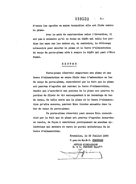 Brevetto per una modalità di montaggio del pennino che evita che si sposti rispetto all'alimentatore, molto simile al Wing-flow della Chilton. Stessa invenzione di nº GB-420064. Stessa invenzione di nº DE-645085. Stessa invenzione di nº FR-792631.