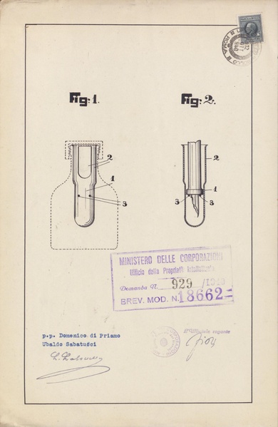 Privativa industriale per un modello di fabbrica. Testo descrittivo della registrazione: "Dosatore salvapenna per l'introduzione dell'inchiostro nelle penne stilografiche".