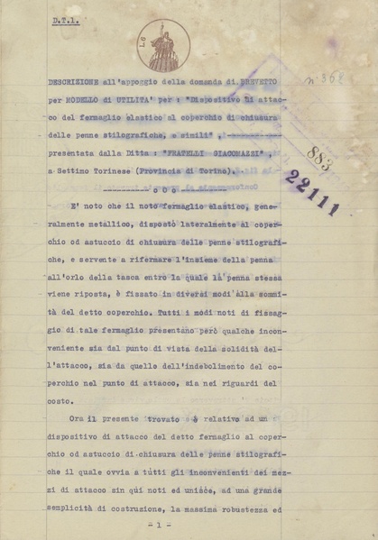 Privativa industriale per un modello di utilità della Giacomazzi. Testo descrittivo della registrazione: "Dispositivo di attacco del fermaglio elastico al coperchio di chiusura delle penne stilografiche, e simili.".