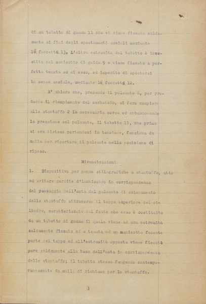 Privativa industriale per un modello di fabbrica. Testo descrittivo della registrazione: "Dispositivo per stilografiche a stantuffo atto ad evitare perdite d'inchiostro in corrispondenza del pulsante".