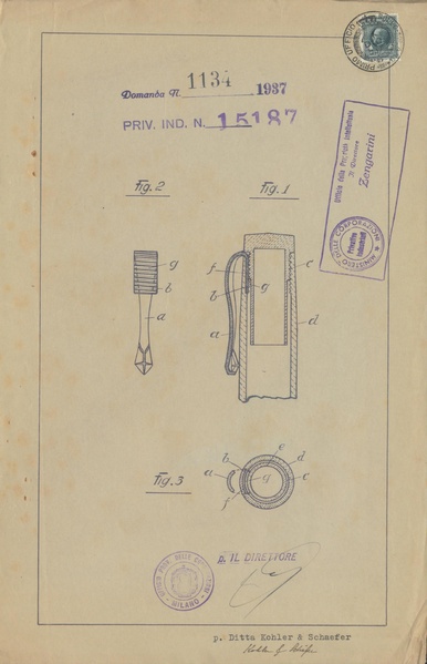 Privativa industriale per un modello di fabbrica della Kosca. Testo descrittivo della registrazione: "Fermaglio per stilo di penna a serbatoio, matita a serbatoio e simili".