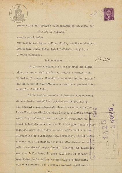 Privativa industriale per un modello di utilità della Pagliero. Testo descrittivo della registrazione: "Fermaglio per penne stilografiche, matite e simili".