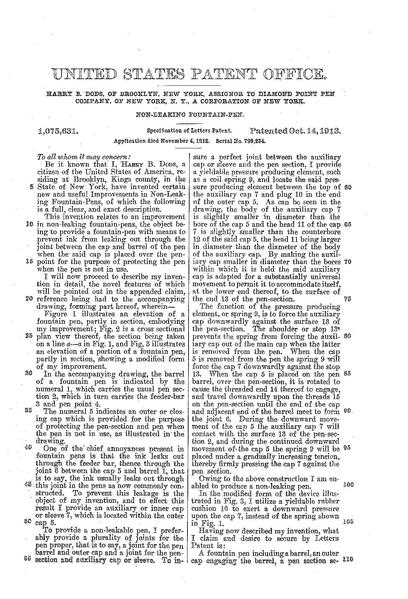 | current | 16:17, 19 August 2012 | 1,159 × 1,704, 3 pages (133 KB) | Piccardi (talk | contribs) | {{PatentInfo |Inventor=Harry B. Dods |Assignee=Diamond Point Company |Country=US |ApplicationNum=729234 |ApplicationDate=1912-11-04 |PatentNum=1075631 |PatentDate=1913-10-14 |PriorityDate=1912-11-04 |Titolo=Design for a fountain pen |Marca=Diamond |Des... |