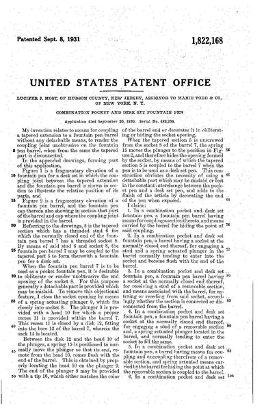 | current | 12:57, 2 January 2013 | 1,159 × 1,704, 3 pages (90 KB) | Piccardi (talk | contribs) | {{PatentInfo |Inventor=Lucifer J. Most |Assignee=Mabie, Todd & Co. |Country=US |ApplicationNum=483204 |ApplicationDate=1930-09-20 |PatentNum=1822168 |PatentDate=1931-09-08 |PriorityDate=1930-09-20 |Titolo=Combination pocket and desk set fountain pen |M... |