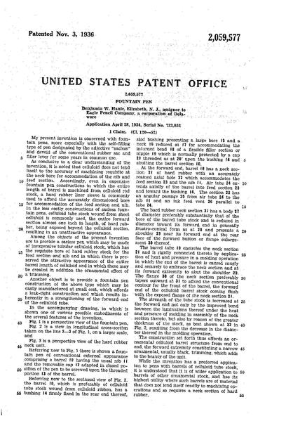 | current | 16:11, 26 June 2012 | 1,159 × 1,704, 3 pages (104 KB) | Piccardi (talk | contribs) | {{PatentInfo |Inventor=Benjamin W. Hanle |Assignee=Eagle Pencil Company |Country=US |ApplicationNum=722852 |ApplicationDate=1934-04-28 |PatentNum=2059577 |PatentDate=1936-11-03 |PriorityDate=1934-04-28 |Titolo=Fountain pen |Marca=Eagle |Descrizione=Cos... |
